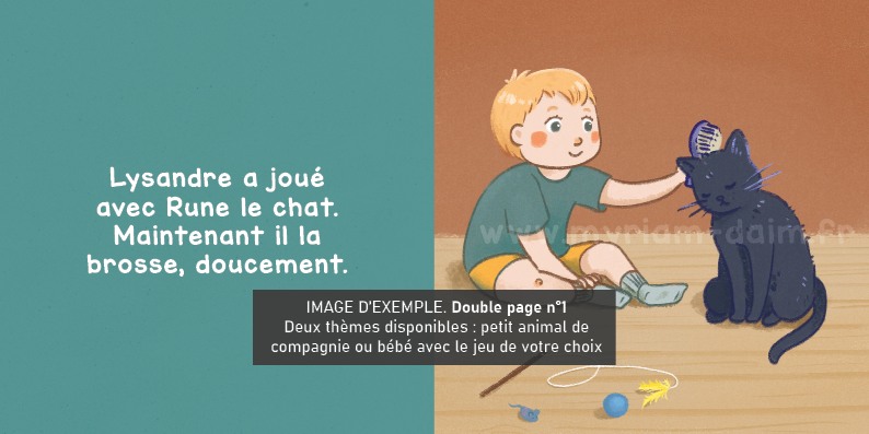 Double page n°1 : bébé joue avec l'animal de la famille ou avec ses jouets